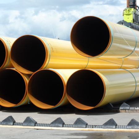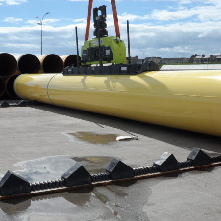 On the quay we use Dhatec pipe storage system. This system can be easily adjusted to different pipe diameters and is completely safe to store pipes until further transportation to their final location.