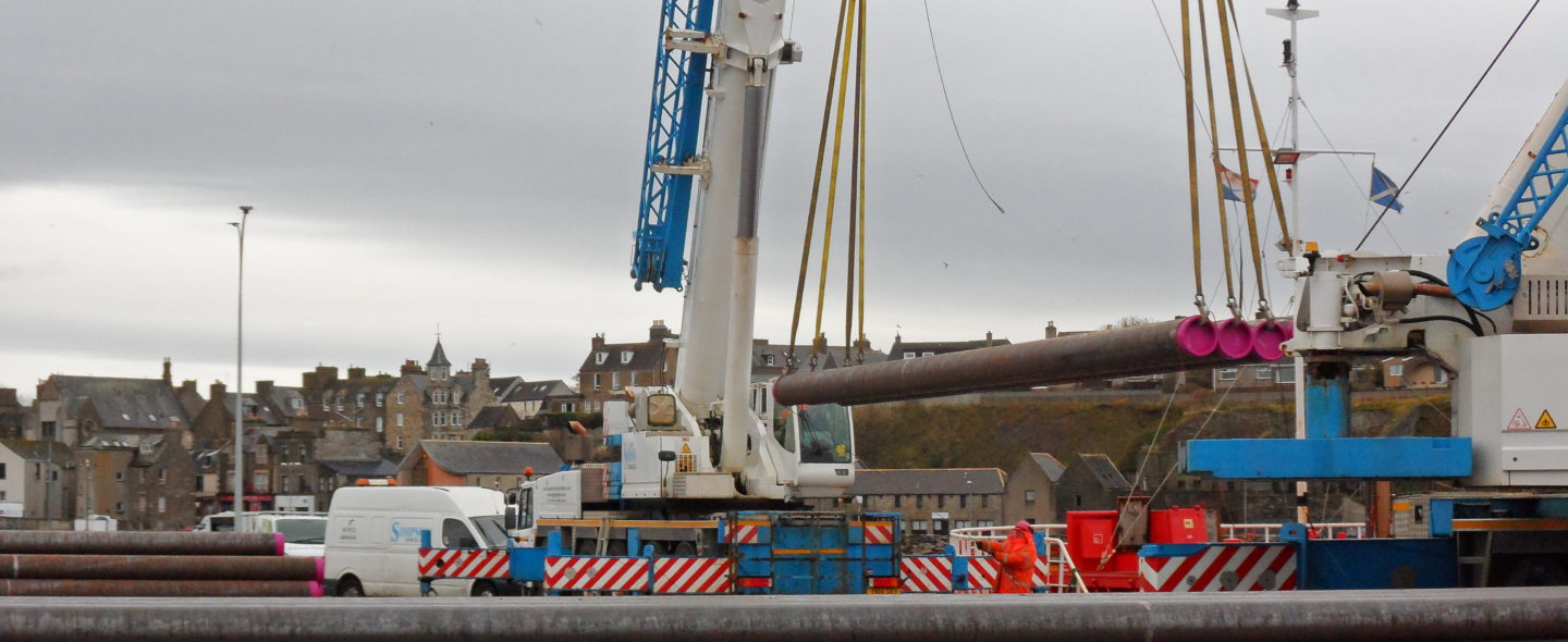 Hugh Simpson (Contractors) Ltd unloaded 775 pipes (11.9-12.5 m long with 219-406 mm outer diameter from marine vessel H&S Prudence, which arrived in Wick Harbour on 22/10/2019. Two cranes rigged with spreader beams and pipe shoes were set up, to unload pipes on to the quay. On the quay we use Dhatec pipe storage system. This system can be easily adjusted to different pipe diameters and is completely safe to store pipes until further transportation to their final location.